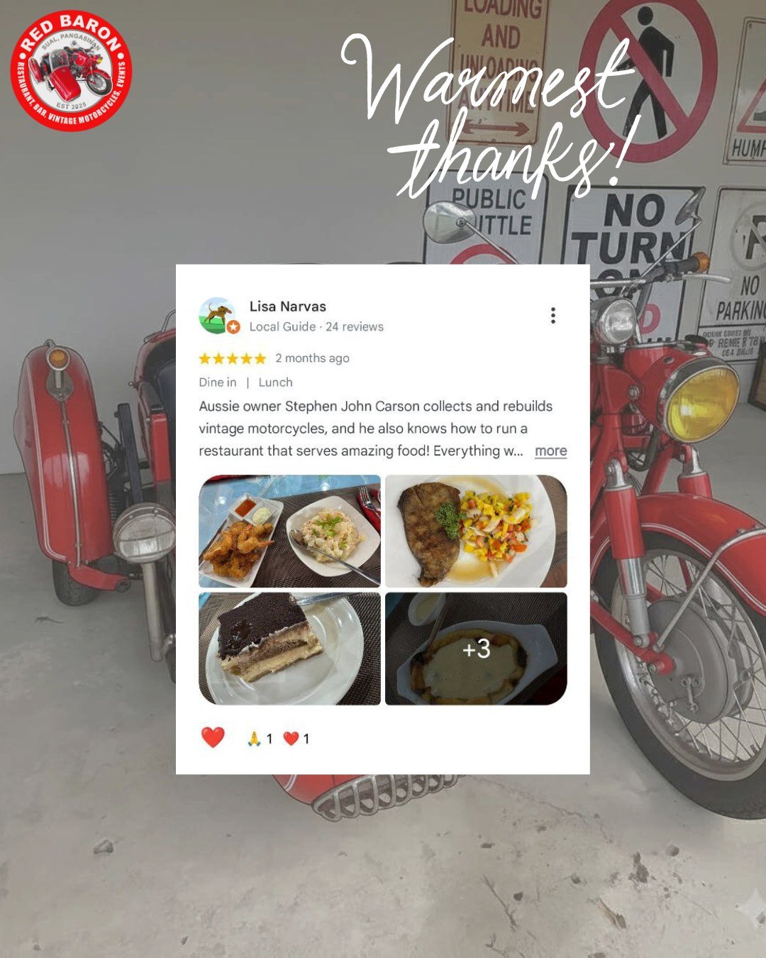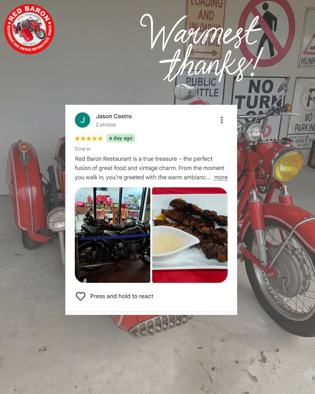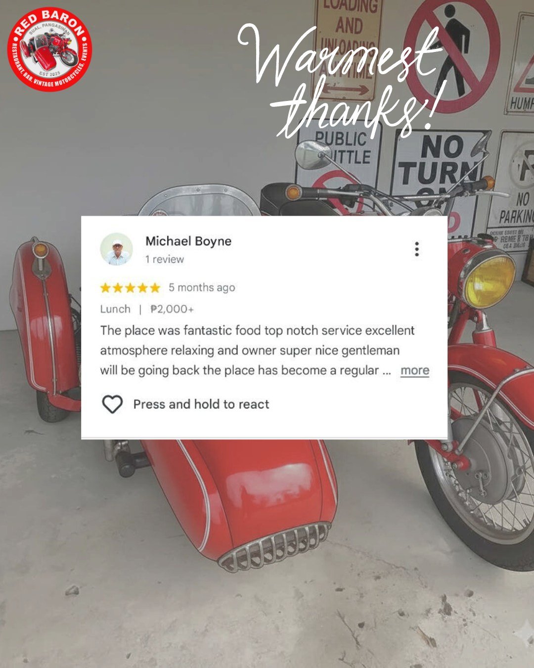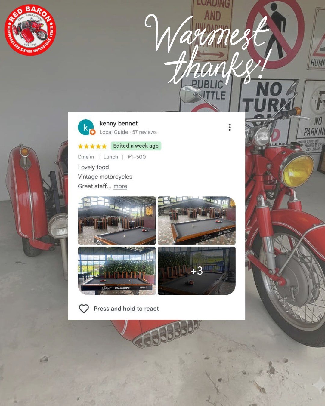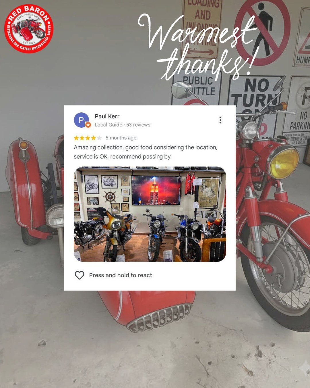 Red Baron was born from a shared love of classic motorcycles and exceptional food. Our founder, Stephen John Carson, a retired Chief Engineer envisioned a place where enthusiasts could gather, admire these timeless machines, and enjoy delicious meals in a relaxed and welcoming setting. We’ve curated a collection of vintage motorcycles that embody the spirit of freedom and adventure, and our menu features dishes different parts of the world, crafted with fresh, locally sourced ingredients