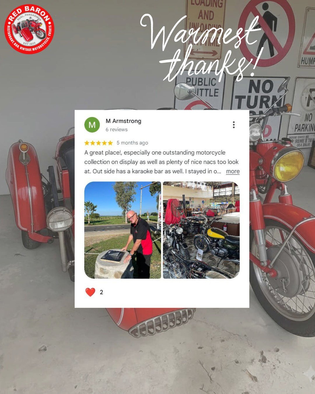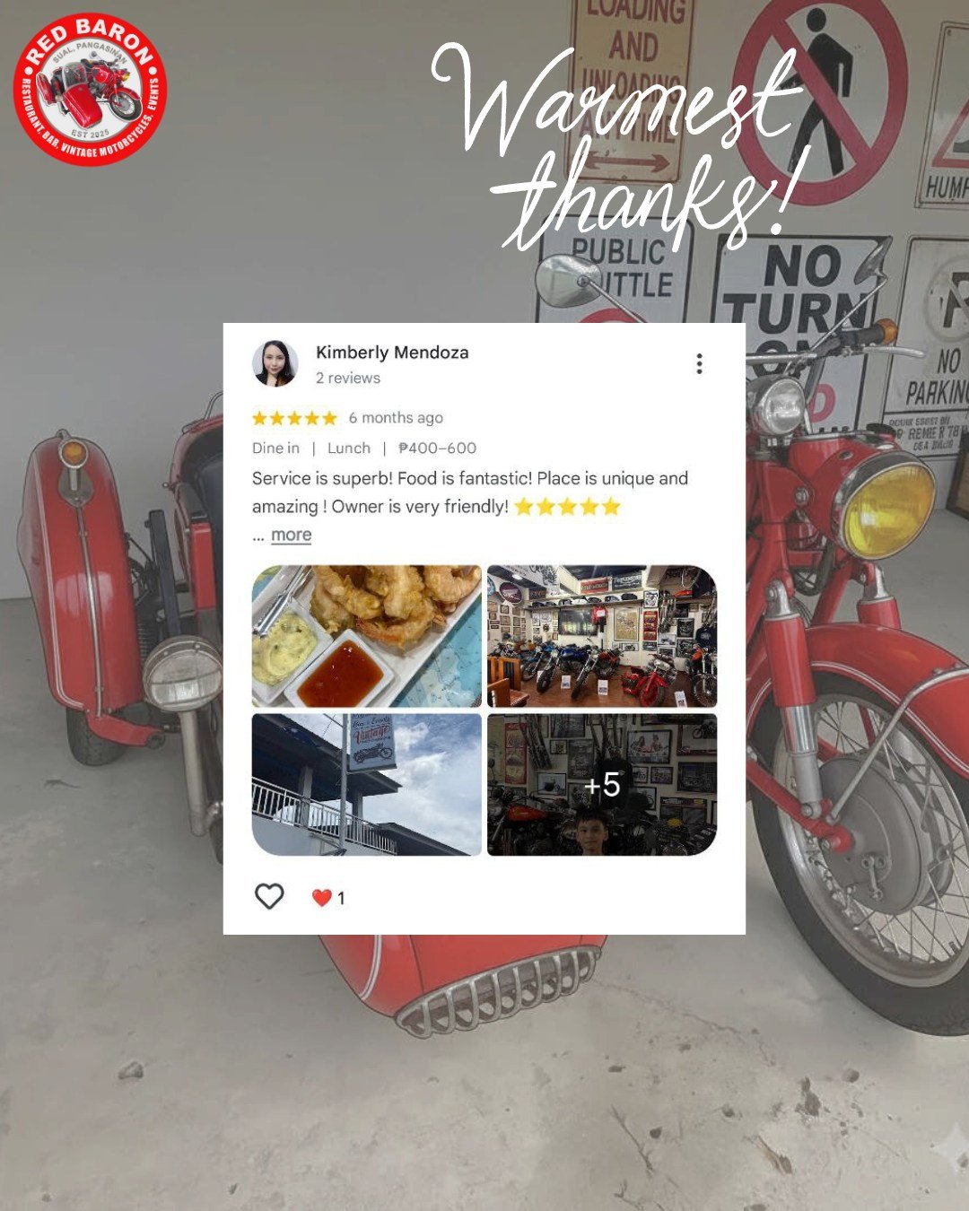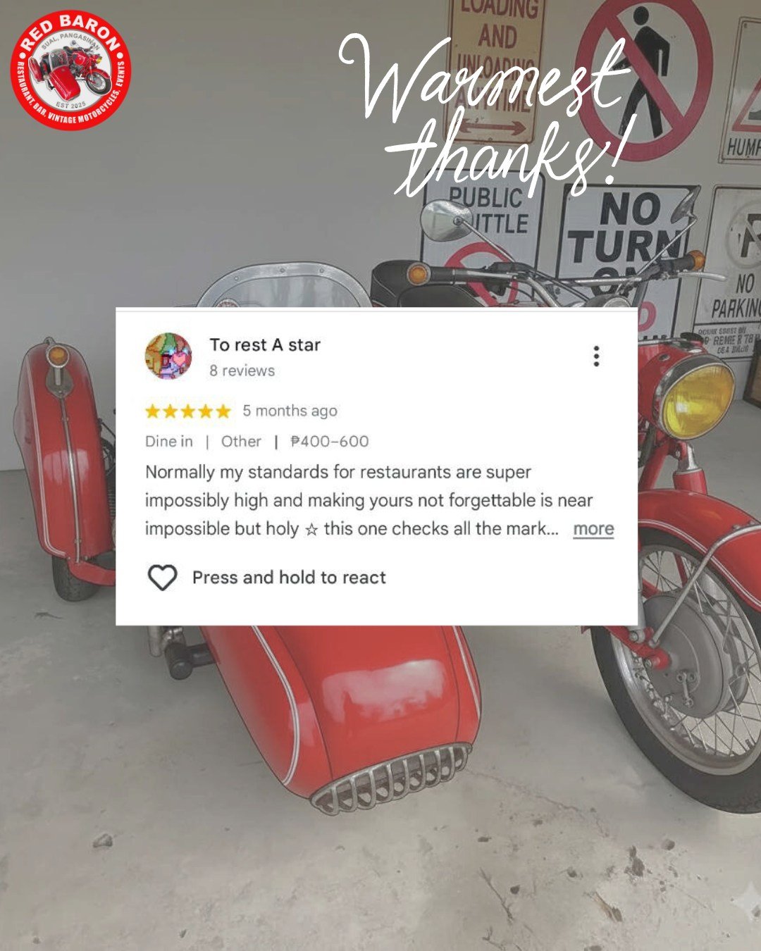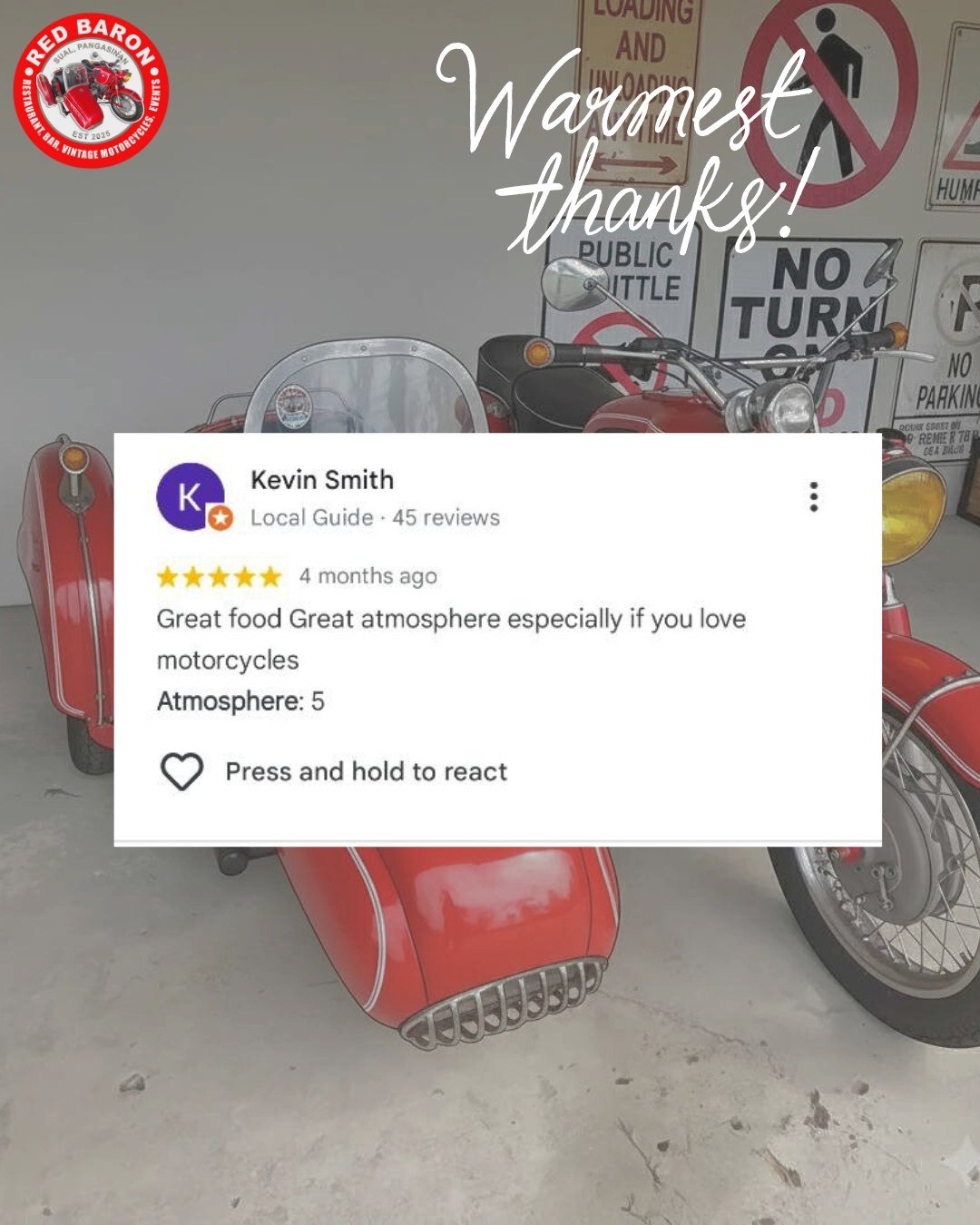 Red Baron was born from a shared love of classic motorcycles and exceptional food. Our founder, Stephen John Carson, a retired Chief Engineer envisioned a place where enthusiasts could gather, admire these timeless machines, and enjoy delicious meals in a relaxed and welcoming setting. We’ve curated a collection of vintage motorcycles that embody the spirit of freedom and adventure, and our menu features dishes different parts of the world, crafted with fresh, locally sourced ingredients
