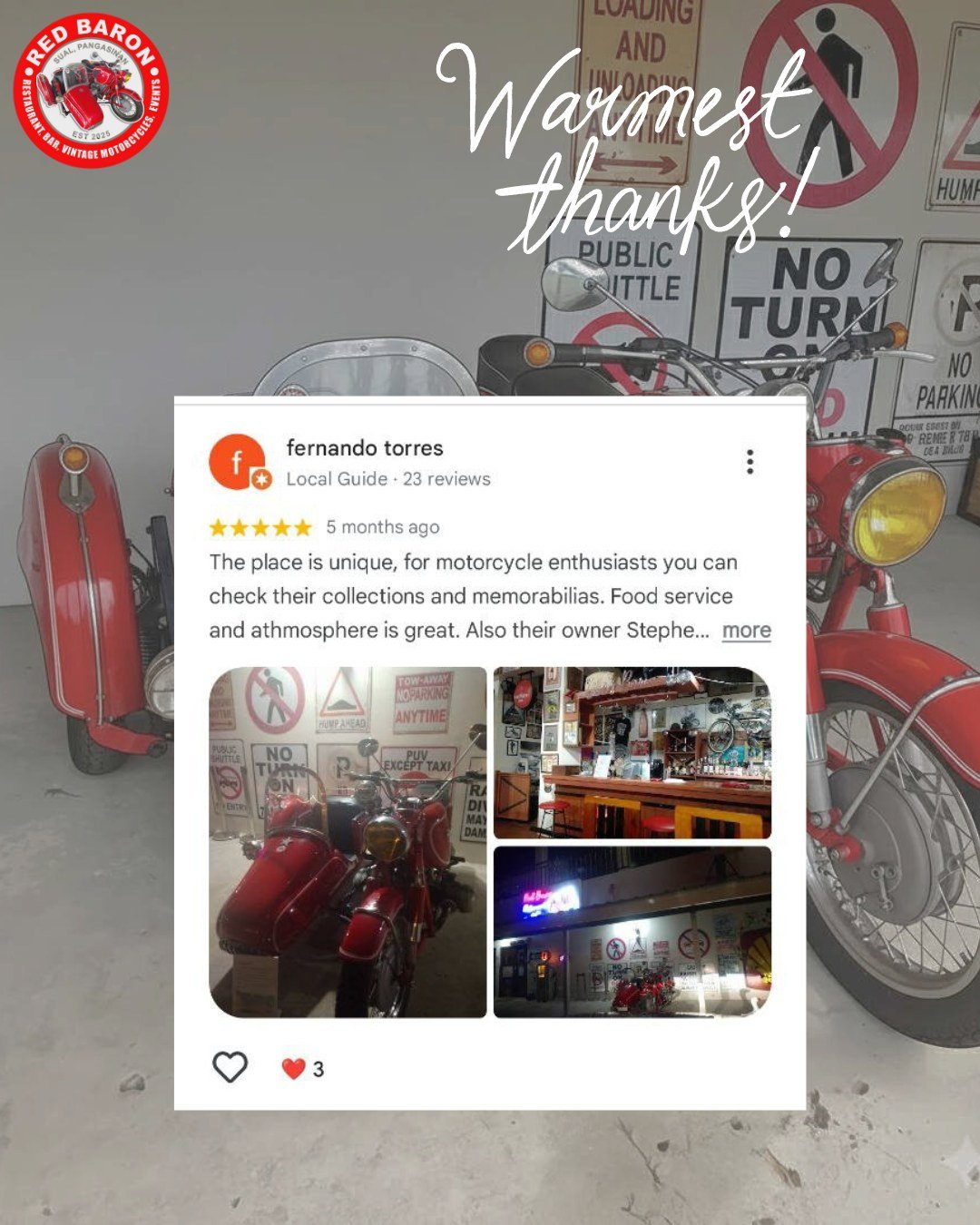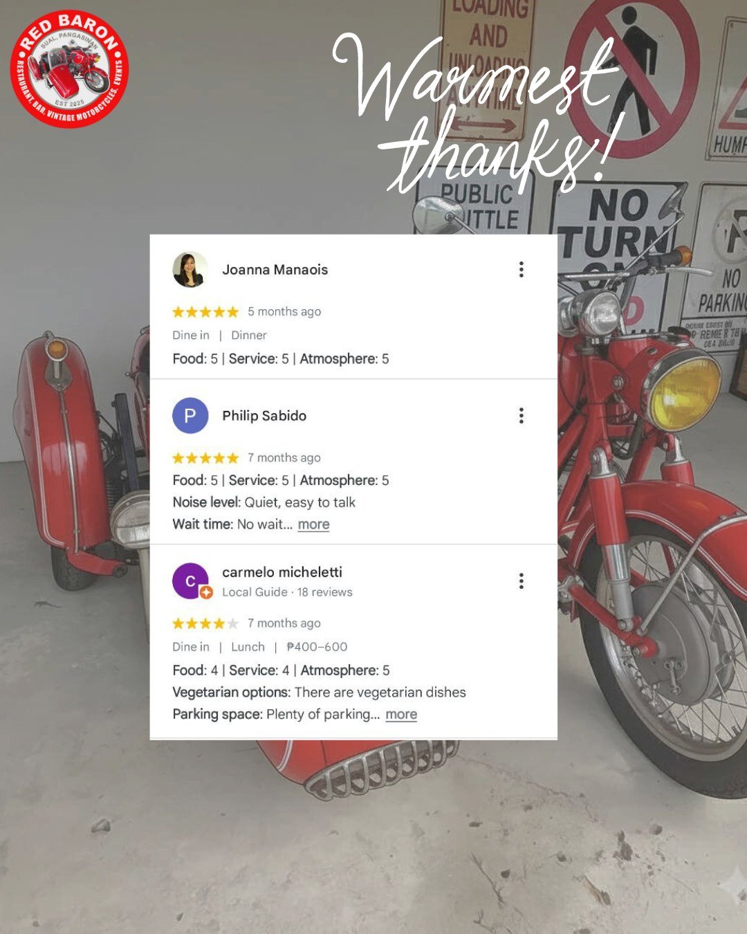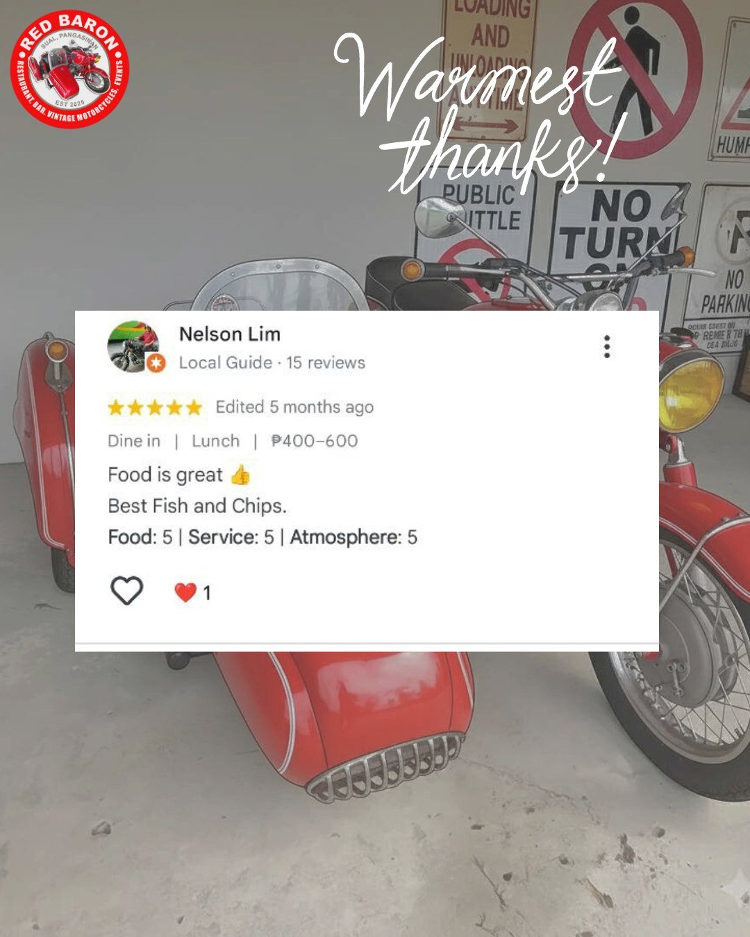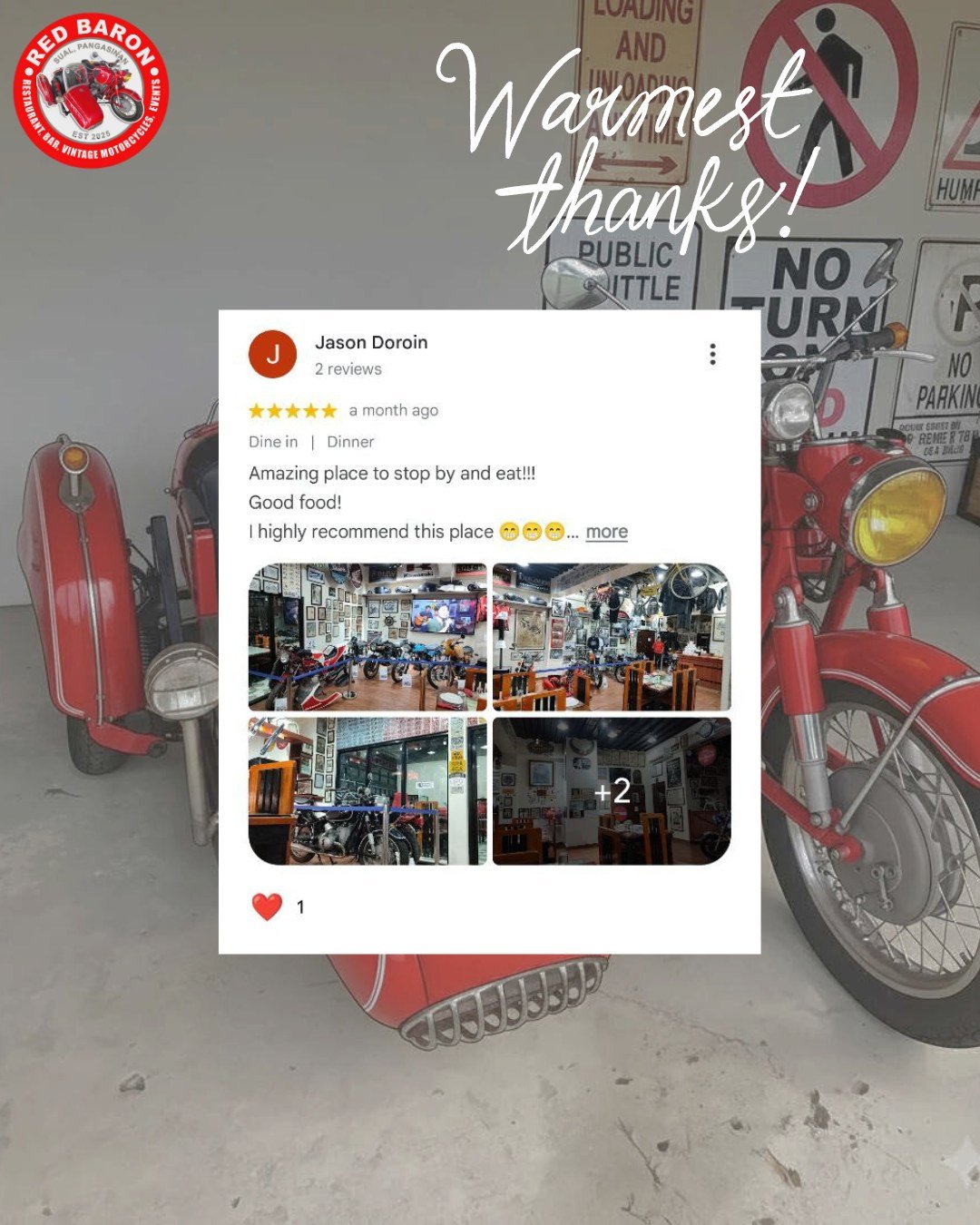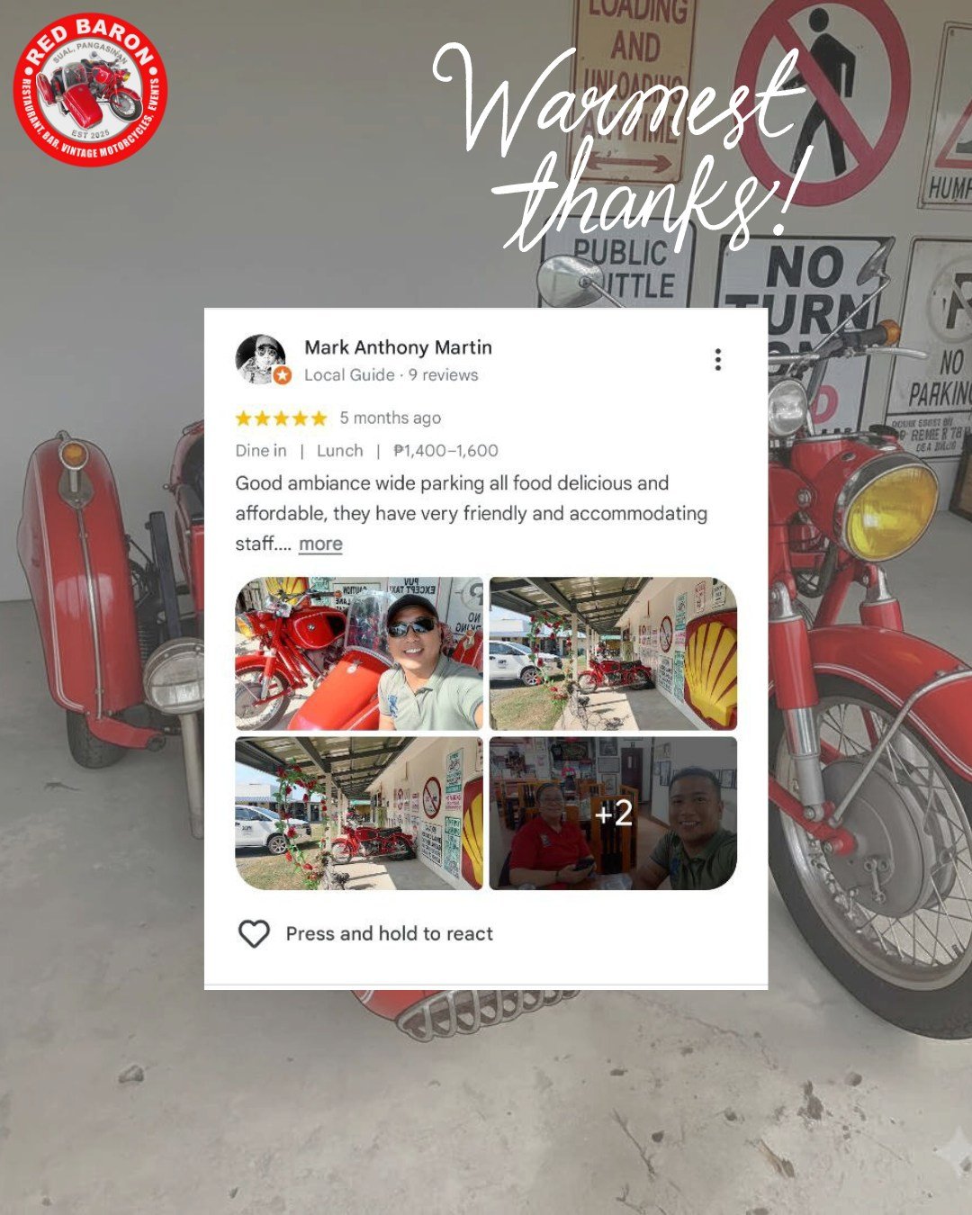 Red Baron was born from a shared love of classic motorcycles and exceptional food. Our founder, Stephen John Carson, a retired Chief Engineer envisioned a place where enthusiasts could gather, admire these timeless machines, and enjoy delicious meals in a relaxed and welcoming setting. We’ve curated a collection of vintage motorcycles that embody the spirit of freedom and adventure, and our menu features dishes different parts of the world, crafted with fresh, locally sourced ingredients